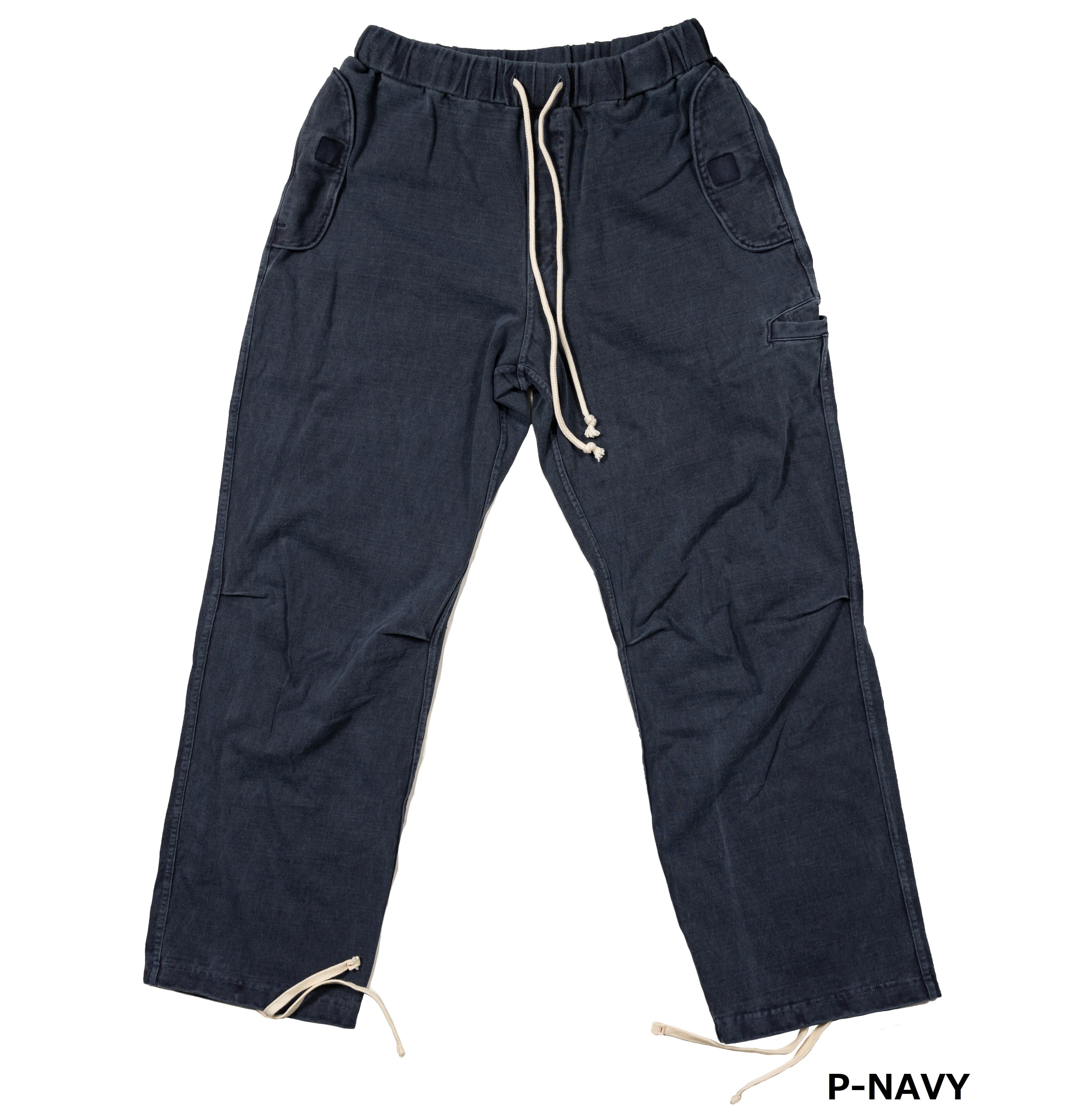 膝のタックや裾のドローコードなどミリタリーワイドパンツをモチーフにしたディテールがアクセント。9ozのジャージ素材はピグメント染めにより履き込む程に特有のアタリがでて、デニムのようなエイジングが楽しめます。