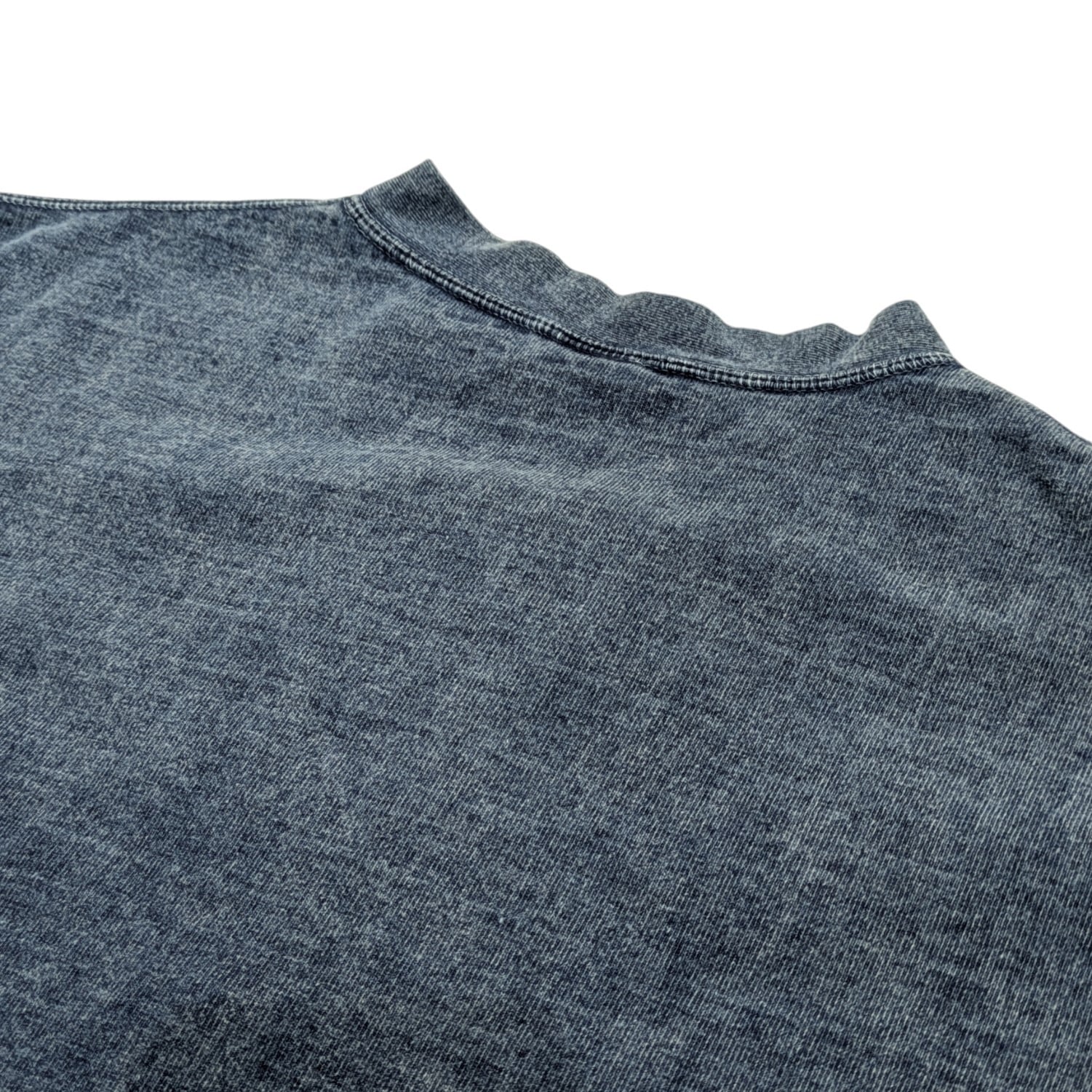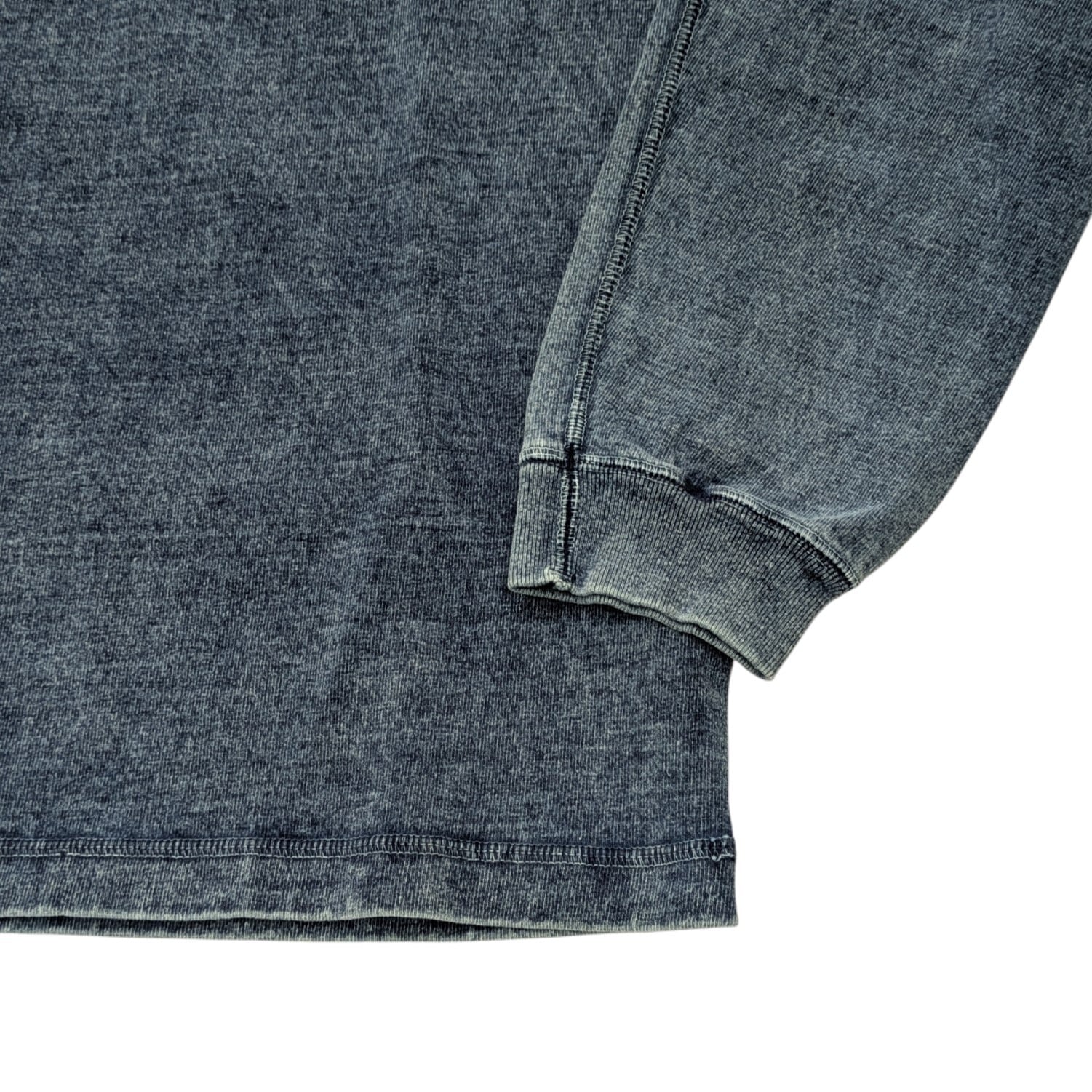 機械式での染色が多い中、風合いを出すため熟練された職人により1枚1枚時間と手間をかけ手染めしております。その為、染め上がりに多少の個体差はありますが着込む程になじみインディゴ特有の深みと色落ちにより出るブルーデニムのようなアタリのコントラストを楽しめます。